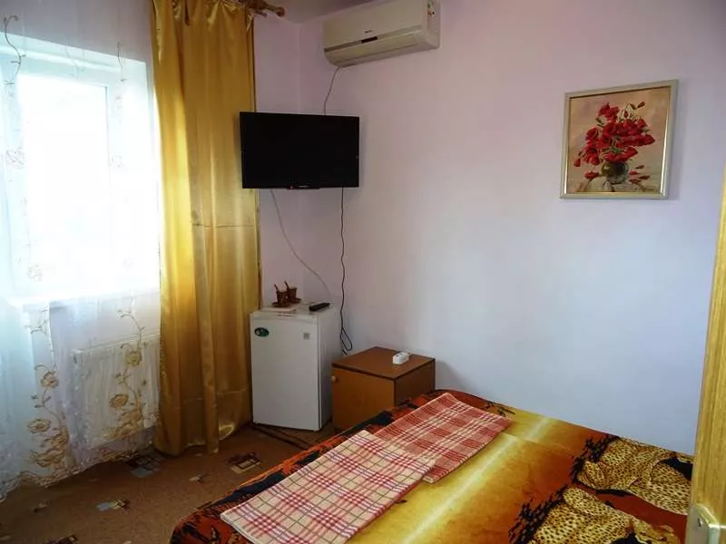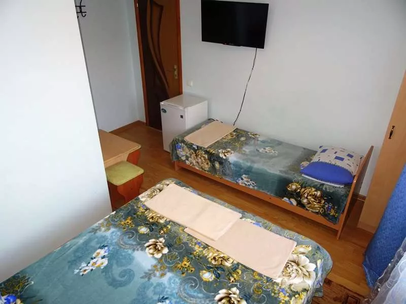 Размещение : Гостевой дом оснащён номерами с удобствами. 2-х, 3-х, 4-х и 5-ти местные номера. В каждом из них: одно- и двуспальные кровати, шкаф для одежды, телевизор, сплит-система, в номерах Стандарт и с удобствами на этаже дополнительно есть холодильник. Холодная и горячая вода круглосуточно.