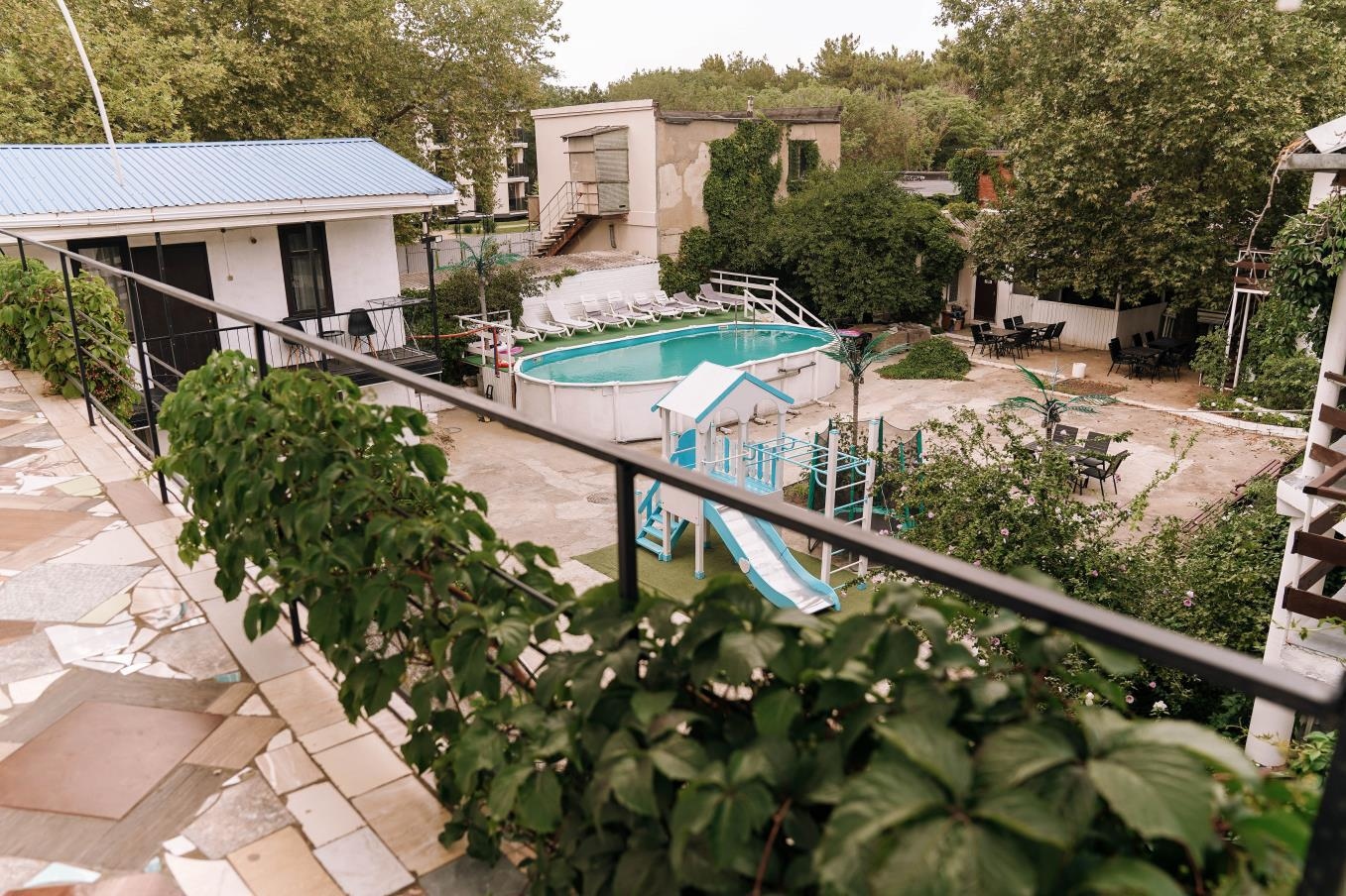 - Закрытая благоустроенная территория с детской площадкой, подогреваемым бассейном, баром, местами для отдыха и парковкой.